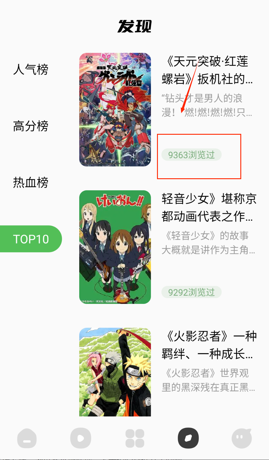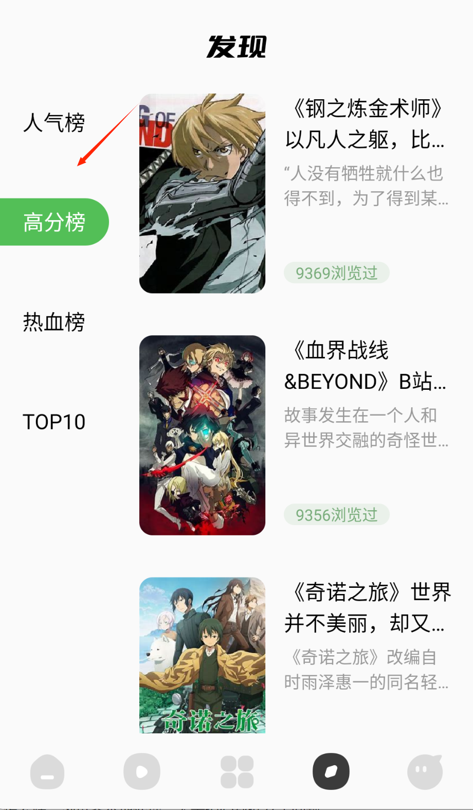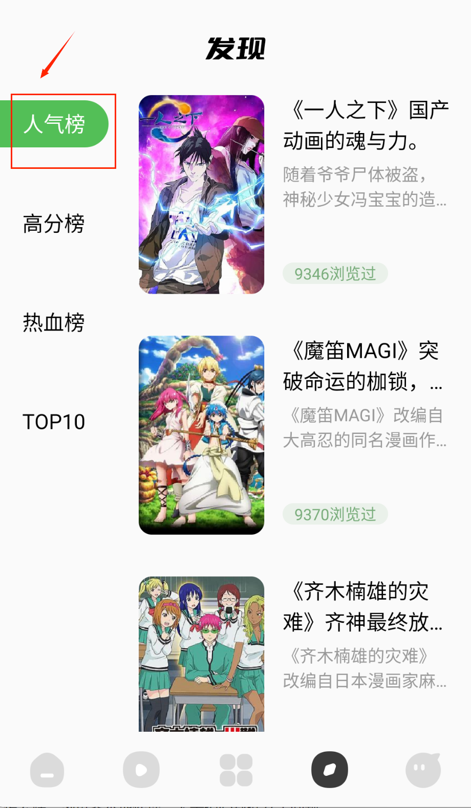 1、进入"发现"页面后,左侧醒目地排列着四大榜单入口:人气榜、高分榜、热血榜和TOP10,每个榜单都经过精心筛选。