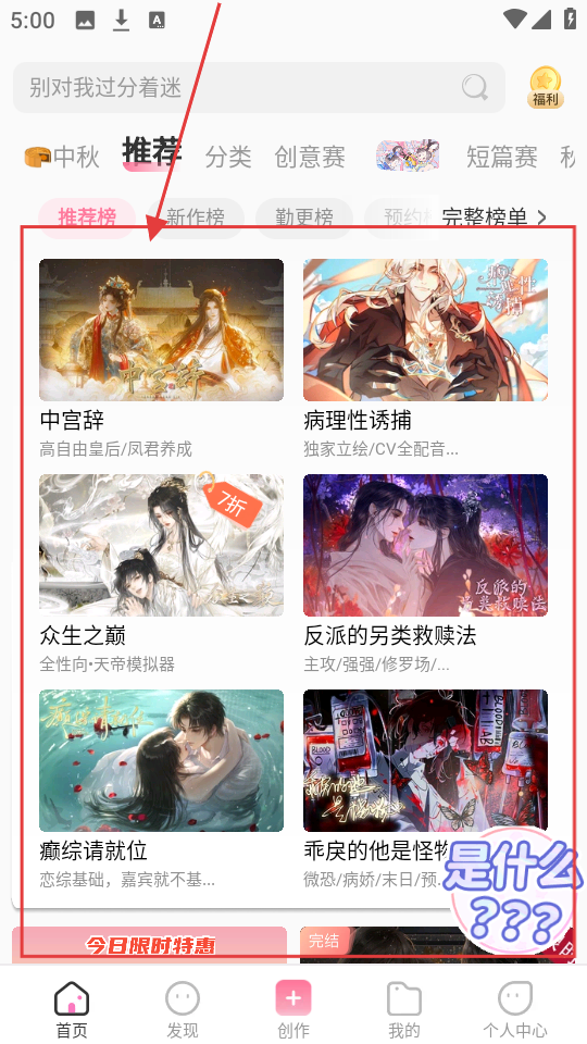 1、首页推荐榜单有不少精彩作品,看到感兴趣的,比如【中宫辞】,点击就能进入详情页啦。