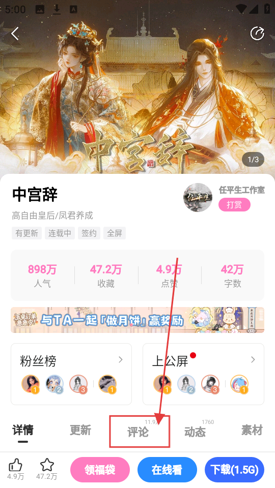 2、进入【中宫辞】详情页后,找到【评论】按钮,点击它就能查看作品的评论区啦。