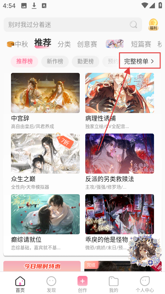 1、我们在软件首页,点击【完整榜单】,就能看到各类榜单,方便查找感兴趣的作品啦。