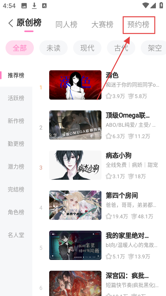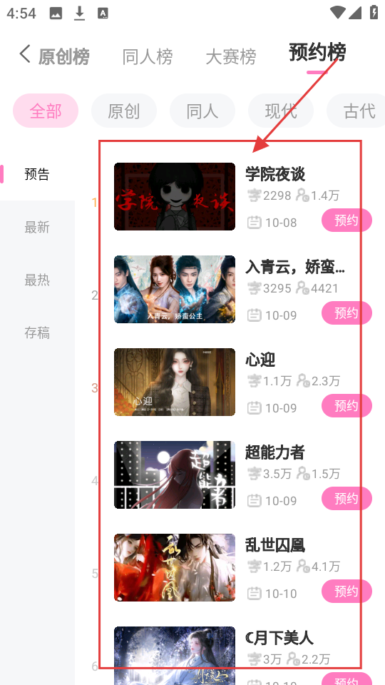 3、在预约榜里,有《学院夜谈》《入青云,娇蛮...》等作品,我们可以挑选想预约的作品。