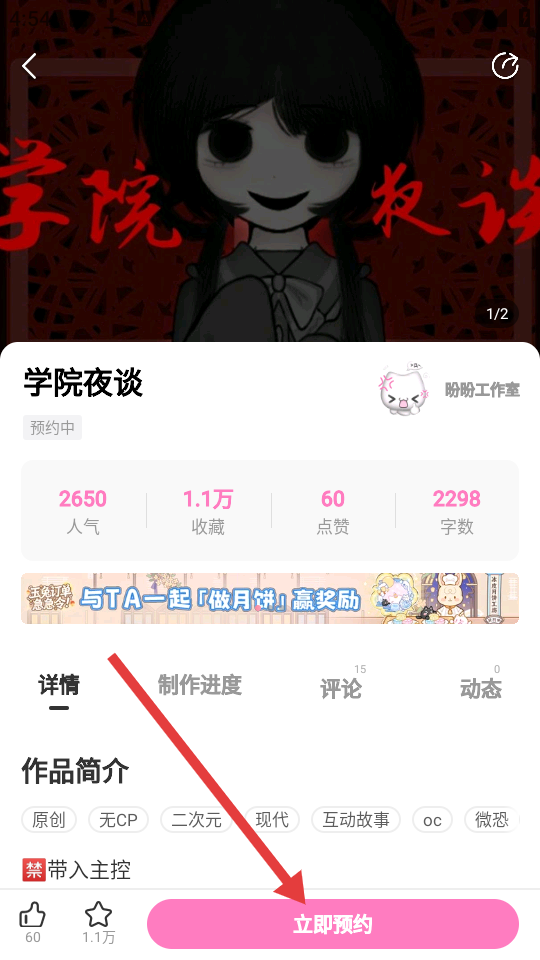 4、选中心仪的作品,比如《学院夜谈》,点击【立即预约】,就成功预约该作品啦。
