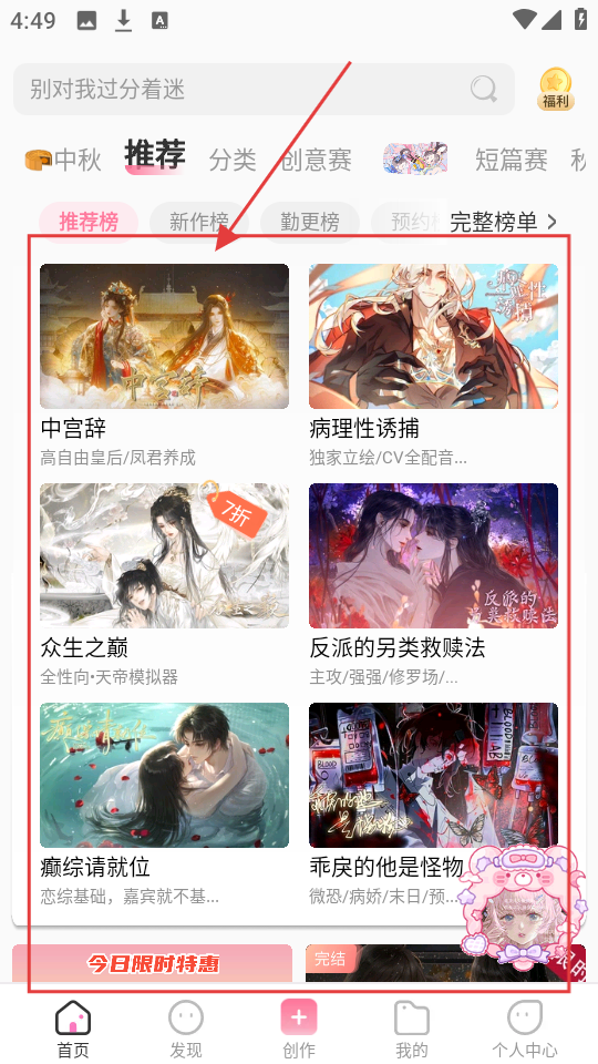 1、在首页推荐榜单里,有好多精彩作品,挑选你感兴趣的,比如【中宫辞】,点击它就能进入详情页啦。