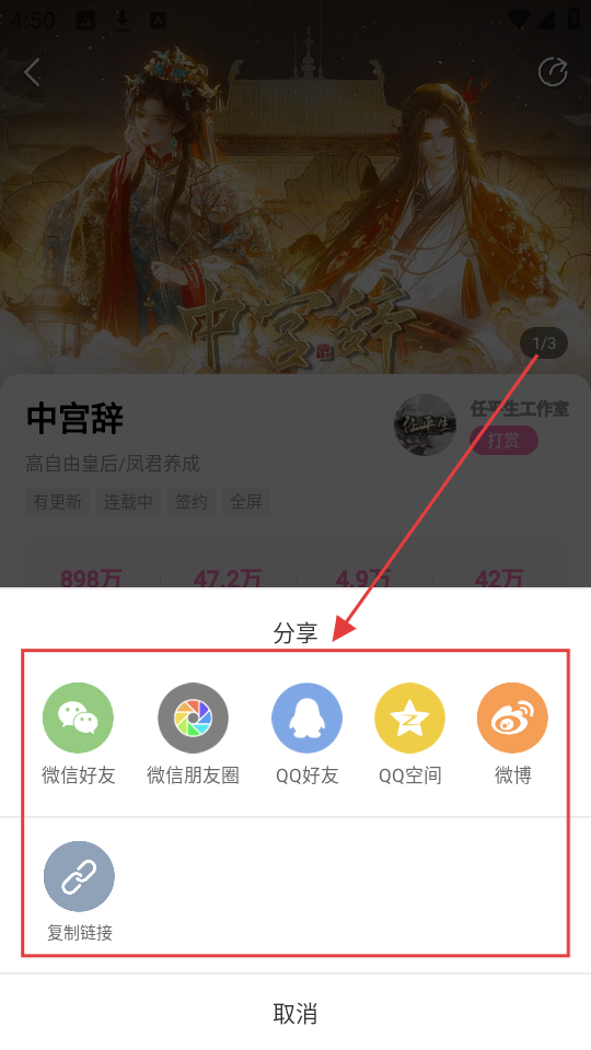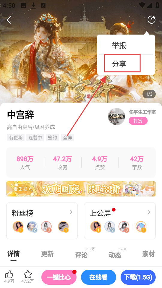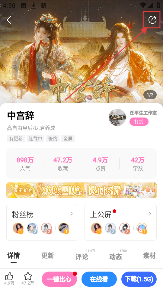 2、进入【中宫辞】详情页后,看到右上角的箭头图标,点击它就能展开更多操作选项啦。