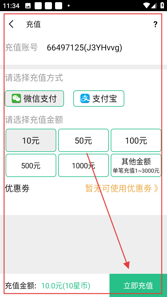 4、在充值界面选择充值方式和金额后,点击【立即充值】,就能完成星币充值啦。