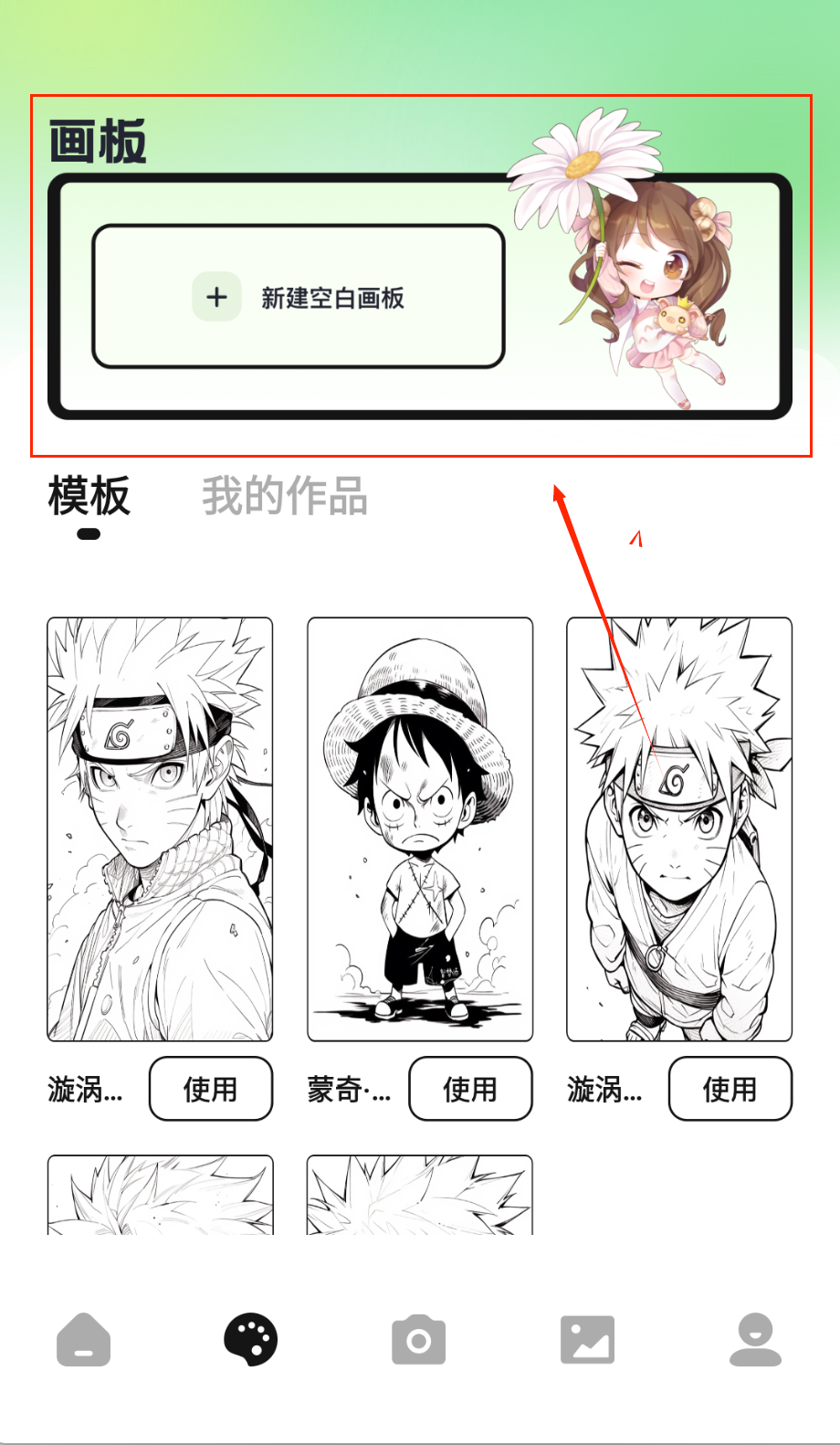 2、可以尝试简单的创作功能,选择模板中的线稿进行临摹练习,使用调色盘工具上色,逐步熟悉绘画工具的使用方法和效果。