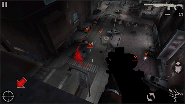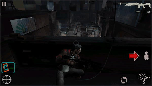 1、下载安装好杀手2影子阴谋,游戏开始我们将身处天台上,并在一个掩护的状态。点击右侧的盾牌箭头图标,主角将站起离开掩护。