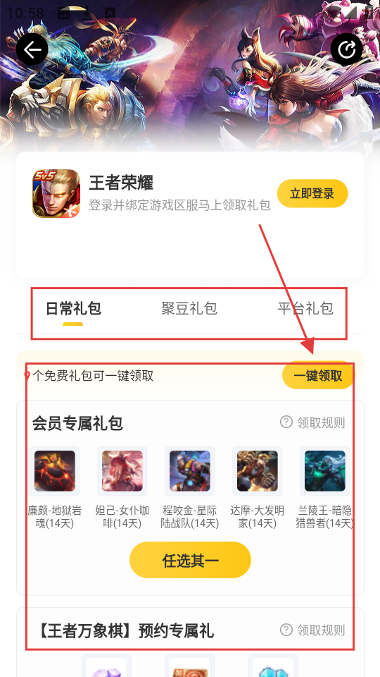 2、进入王者荣耀礼包页,有【日常礼包】等分类,点击【一键领取】能快速领免费礼包,会员还能选专属礼包哦。