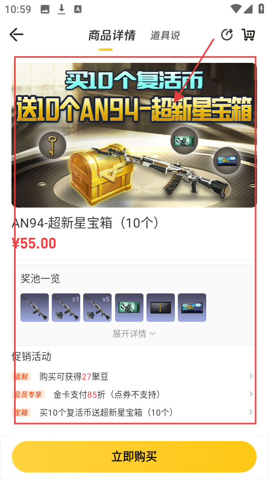 3、在商品详情页,能看到【AN94-超新星宝箱】的奖池和促销活动,想买就点击【立即购买】啦。