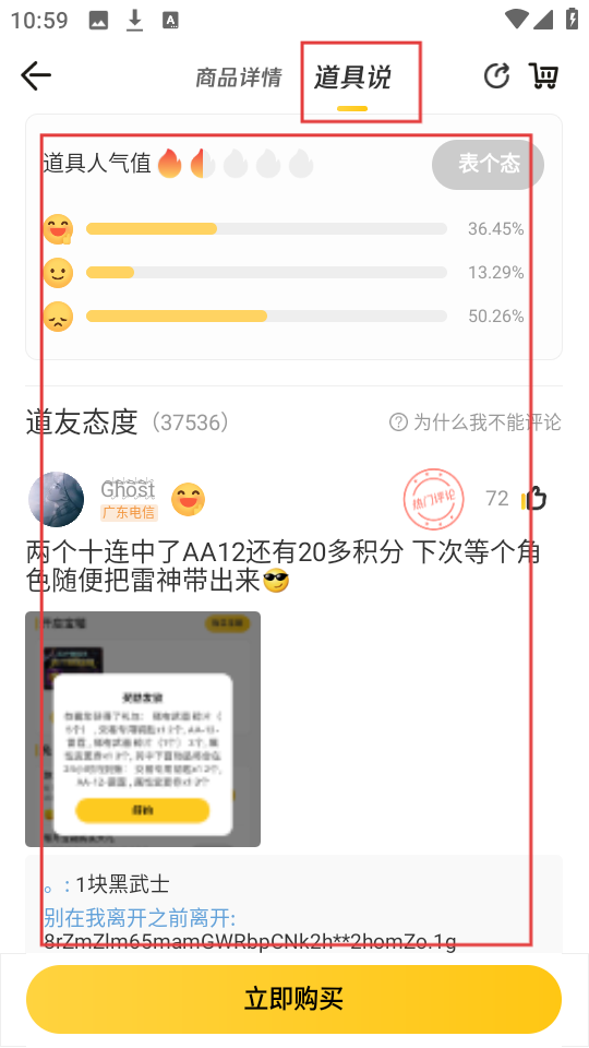 4、点击【道具说】,能看到道具人气值和道友态度,看看大家对道具的评价,再决定是否购买哦。