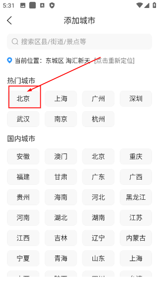 3、在添加城市界面的热门城市区域,点击【北京】选项,将其选定为待查询天气的城市。