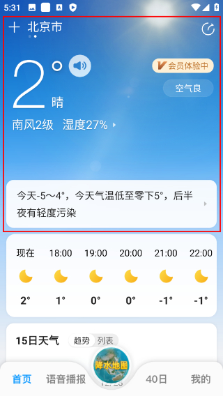 2、实时更新:15日实时天气能够实时更新天气信息,保证用户获取到最新的天气预报,避免因天气突变而造成的不便,还提供了未来15天的天气预报,让用户可以提前了解天气情况,做好出门准备。