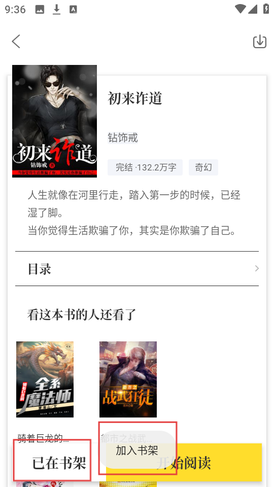 3、加入书架后显示“已在书架”,确认小说成功加入,超简单呢。