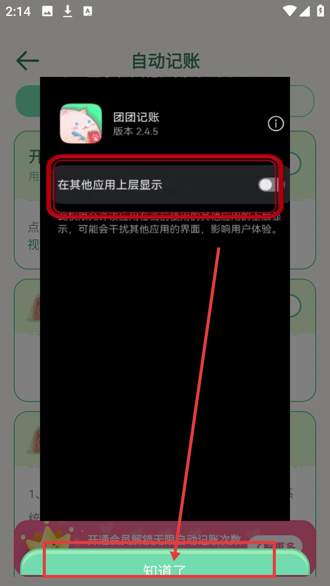 2、进入权限提示页面后,点击【知道了】,可继续进行自动记账的权限配置哦。