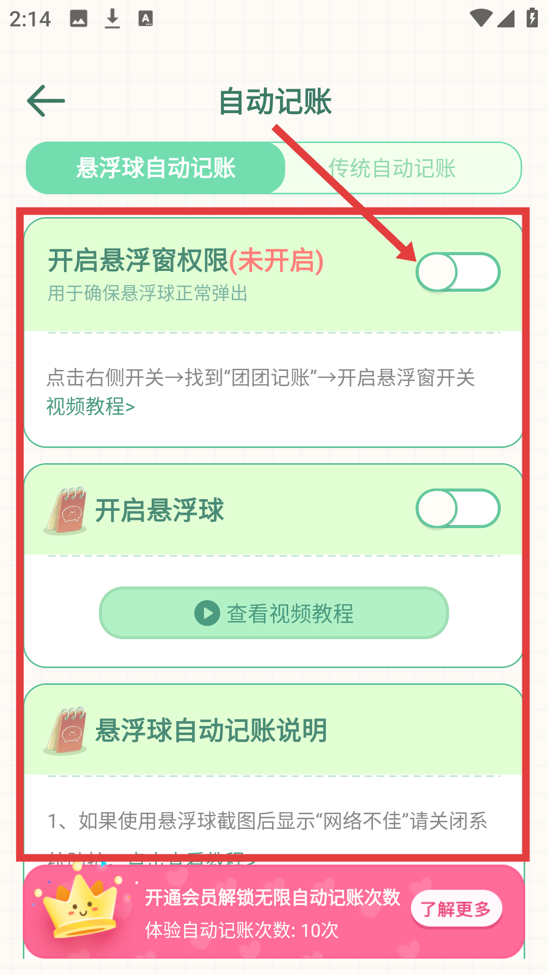 3、在自动记账页面,选择悬浮球自动记账模式,开启悬浮窗权限等设置,即可配置好悬浮球自动记账啦。