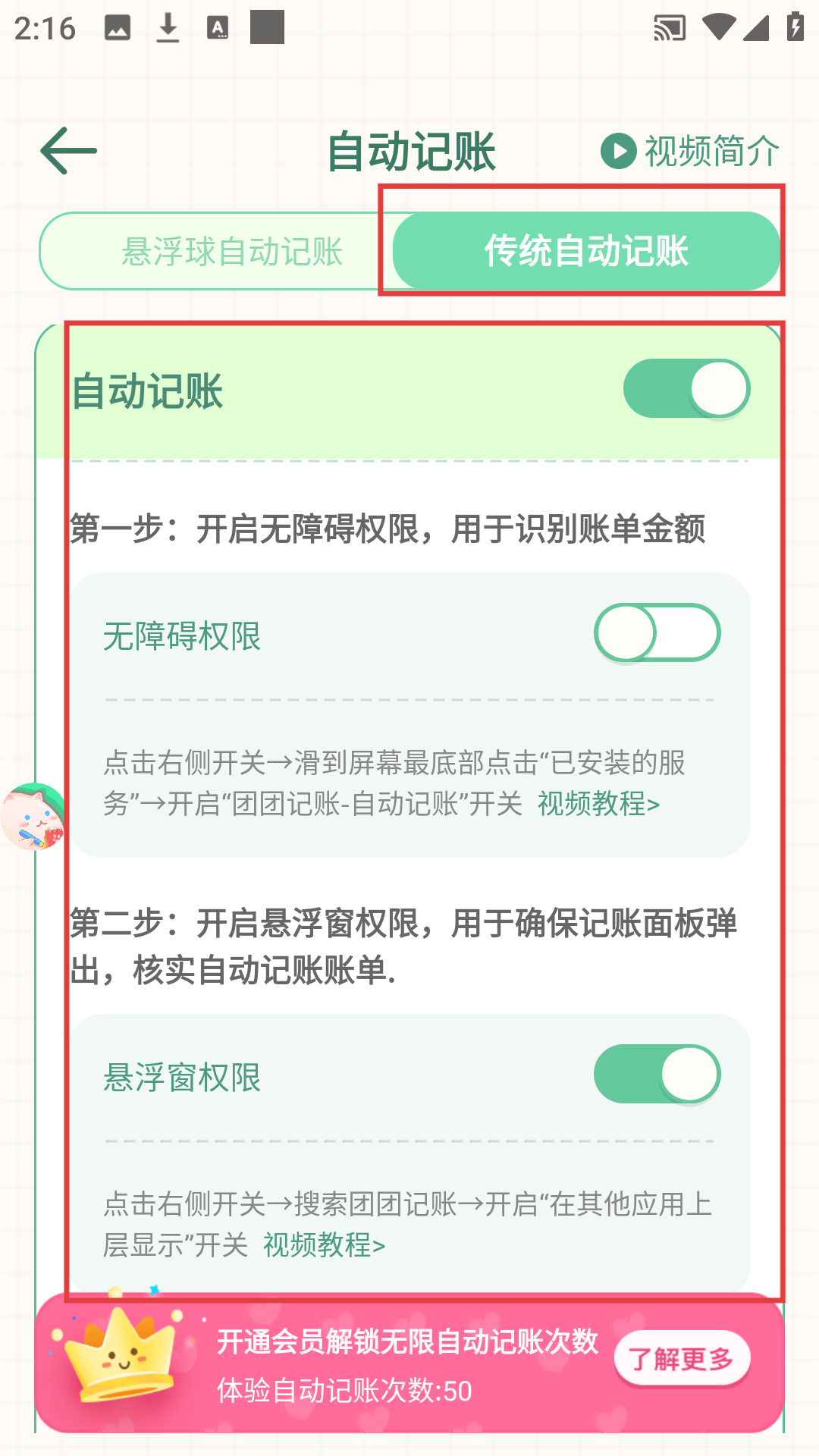 4、切换到传统自动记账模式,开启无障碍权限和悬浮窗权限后,即可使用传统自动记账功能,轻松记录账单哦。
