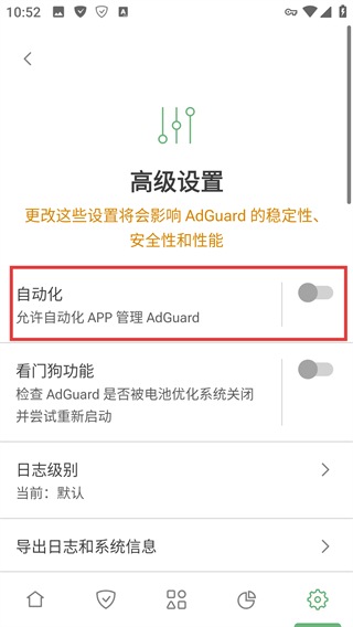 4、进入高级设置页后,可找到【自动化】等选项,按需开启或关闭对应的功能,调整应用运行模式哦。