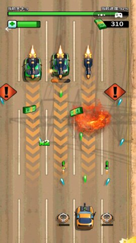 2、操作简单:游戏的操作非常简单易上手,让玩家可以很快就上手游戏。玩家只需要通过手指操作屏幕即可完成驾驶和射击操作,非常方便。