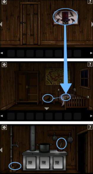 1.我们首先第一个步骤就是根据提示点击床上的四个鸟的【骷髅头】那后拿到床头柜的【火柴】进入到厨房将【匕首】以及【柴火】给拿走;
