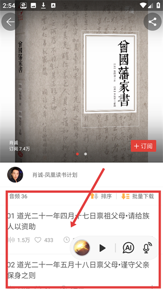 4、进入节目详情页后,点击音频列表中的内容,即可开始播放对应的音频,收听该读书节目的内容啦。