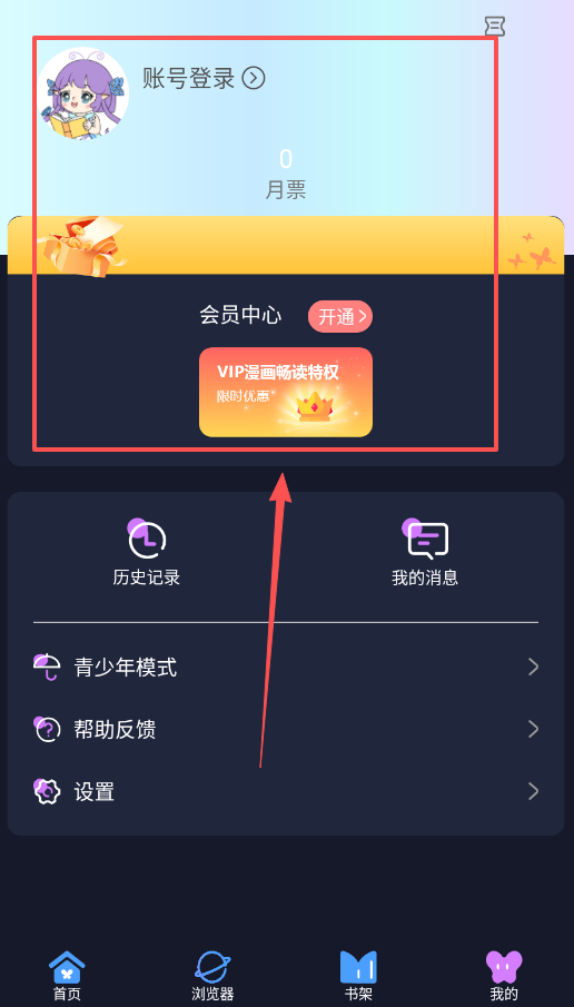 1、首先,在主界面下方导航栏中,点击“我的”进行账号登录呢,登录后可以查看月票数量、进入会员中心。