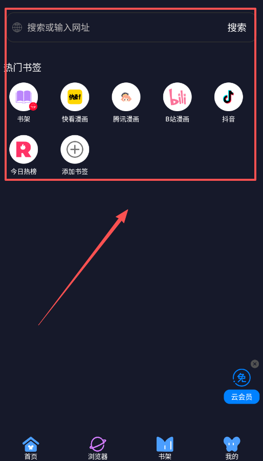 2、接着,你可以使用“浏览器”功能啦,在顶部搜索框直接输入网址或关键词查找漫画,下方会显示热门书签如快看漫画等平台。
