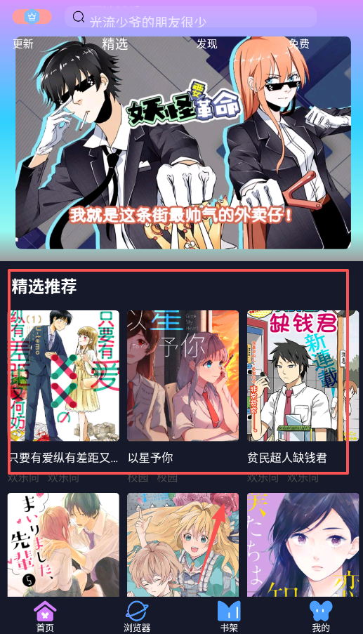 3、找到想看的漫画后,比如“光流少爷的朋友很少”,可以在其详情页查看更新状态、选择精选或免费章节阅读。
