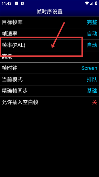 3、在帧时序设置页点击【帧率(PAL)】选项,就能打开对应的帧率选择菜单,更换PAL模式的帧率规则啦。