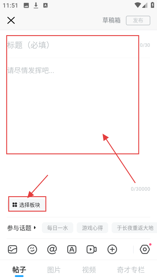 2、在发帖编辑页面,填写标题和内容,然后点击【选择板块】,准备选择发帖板块哦。