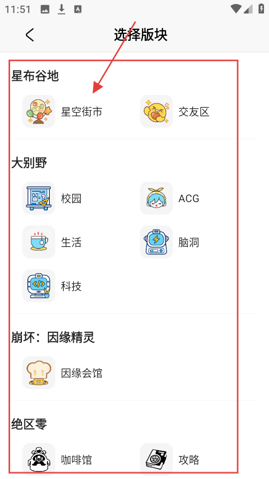 3、在选择板块页面,挑选合适的板块,比如【星空街市】或【ACG】等,确定发帖板块呢。