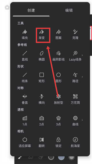 2、展开功能菜单后,选择【渐变】工具,就能开启渐变效果的编辑功能啦。
