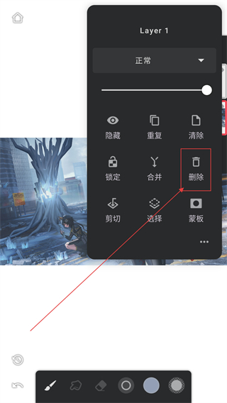 3、选中图层后,在弹出的图层菜单里点【删除】选项,可移除当前选中的图层,精简作品内容呢。