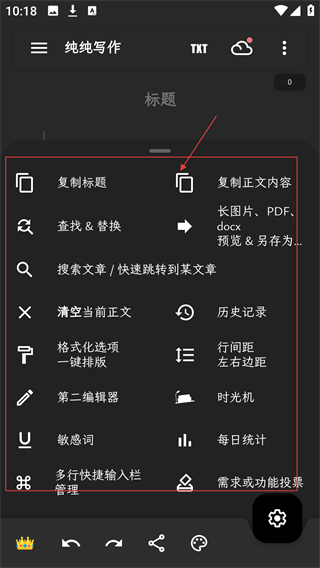 3、展开功能菜单后,可看到【复制正文内容】【查找替换】等功能,助力高效编辑文章呢。