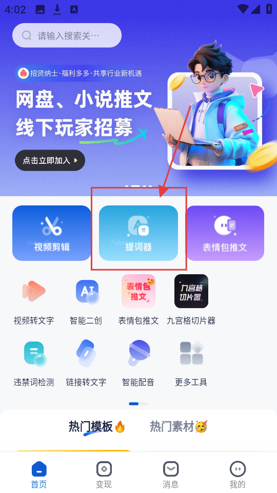 1、我们打开软件,在首页能看到【提词器】等功能选项,点击【提词器】,进入提词器界面。
