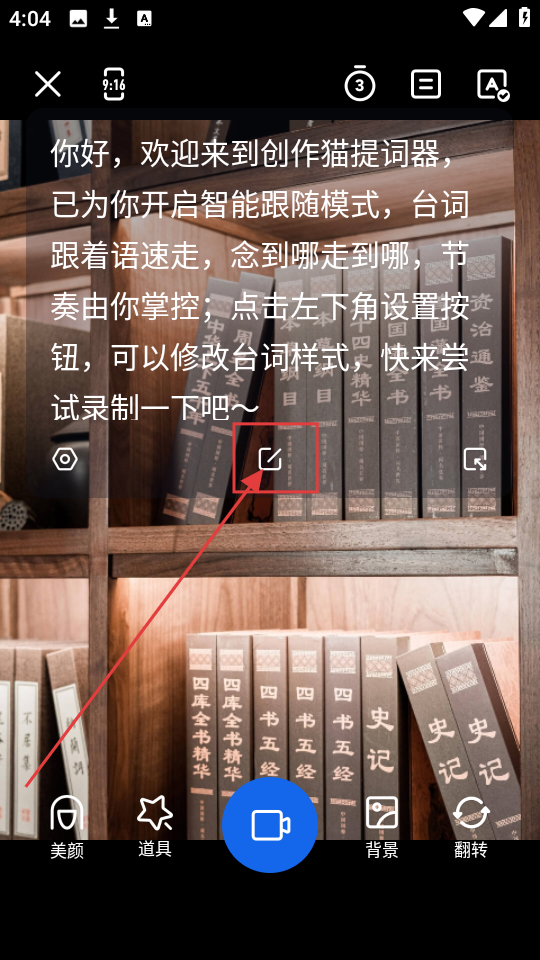 4、台本设置好后,在提词器界面下方,可使用【美颜】【道具】等功能,也能点击拍摄按钮录制视频哦。