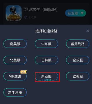 1、下载安装和平精英国际服体验服正版之后,使用加速工具打开软件,选择新亚服加速进入游戏;