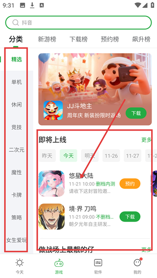 3、在游戏分类页切换到【即将上线】板块,能看到待上线游戏,找到目标游戏点击对应按钮哦。