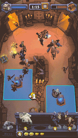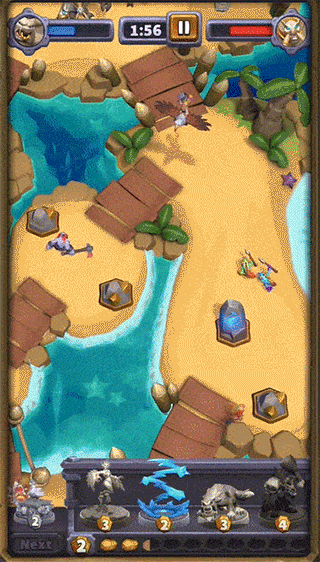 收集资源并部署单位。使用金币储备,通过策略在战场上部署。你会随着时间经过被动获得更多的金币或是通过采矿和寻找宝箱的方式来获得更多金币。