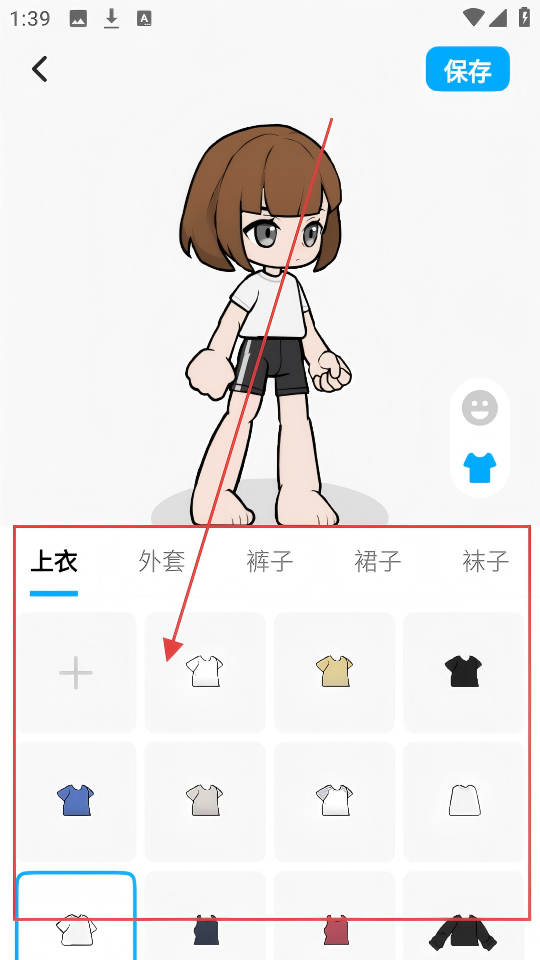 2、形象设置页面有上衣、外套等分类,选喜欢的服饰,比如上衣里的白色T恤,给角色穿上。