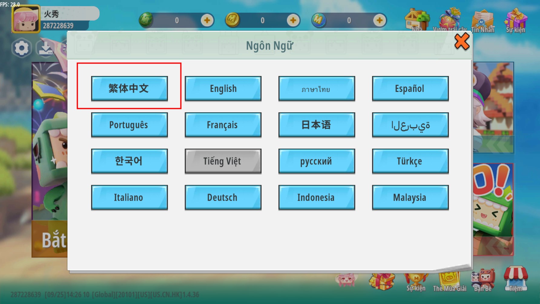 4、点击繁体中文,迷你世界越南服暂不提供简体中文
