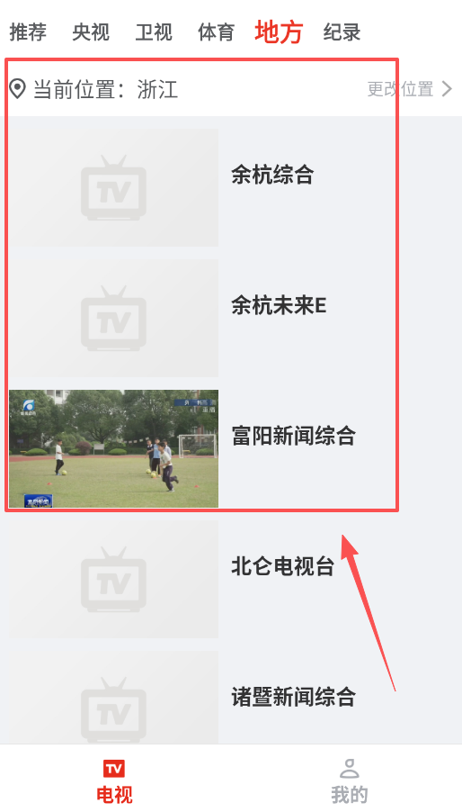 4、切换地理位置很简单,在地方分类下点击当前位置如浙江,选择更改位置,就能切换到余杭、富阳或北仑等地方台。