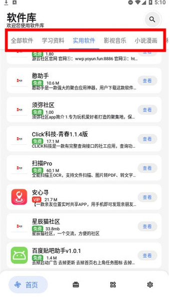 1、点击首页进入到车库里面去以后,可以选择全部软件就能够看到所有的软件,下拉往下看就行,还有分类,分成了学习资料、实用软件、影视音乐、漫画小说这些类型的,比如说使用软件里面的须弥社区、click科技-青春1.4版、扫描pro、星辰猫社区等等!