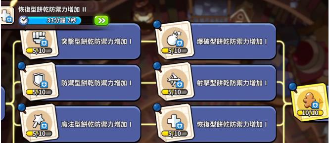 针对研究所内大部分饼干基础能力值提升研究,每个研究都有10个可提升的等级,每提升一级增加就是百分之零点几左右的加成,升满10级会增加相对应属性饼干的基础属性3%。而且5种类型饼干的基础属性有防御、攻击、体力等等研究,整体量非常大,在没有研究加数的7折加成时,建议玩家点5级就够,优先开通路线,等后期再升满。