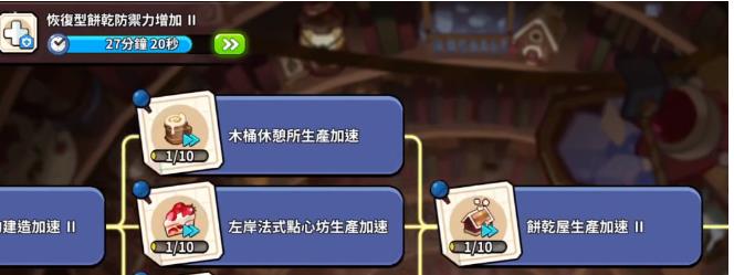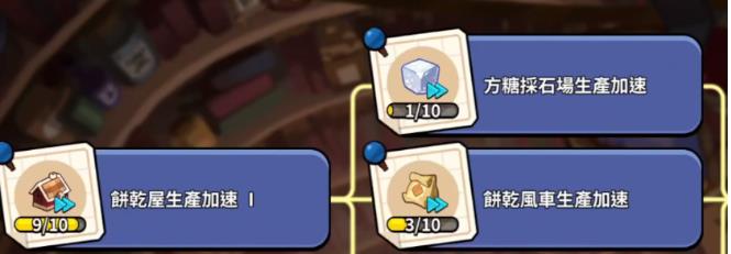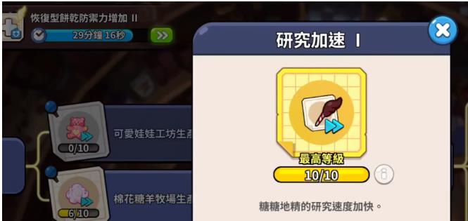 点完饼干研究就可以办隔壁的王国研究,优先点,堂堂地精建造加速,然后拼研究加速时间缩短。以下三项全力升级:饼干小屋生产加速、喷水池生产加速、喷水池经验糖增加。