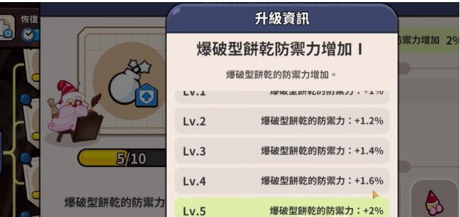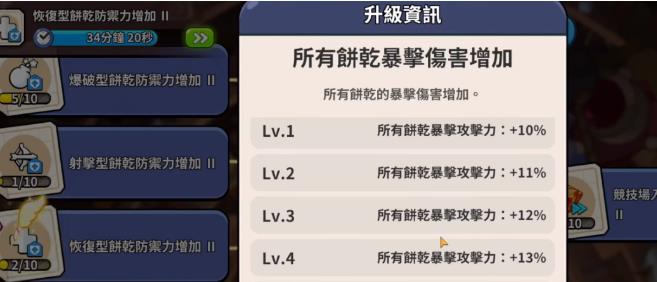 然后多种饼干攻击力、防御力加成均点1级,一直解锁路线,直到所有饼干暴击伤害增加的位置。暴击伤害增加要拉到最高20%,也就是升10个最高等级。一般新手玩家还没有那么快拉到暴击伤害,所以在前期也可以优先升满前三栏:经验星星糖效率增加、一般模式体力果冻消耗量减少、暗黑模式体力果冻减少消耗量。