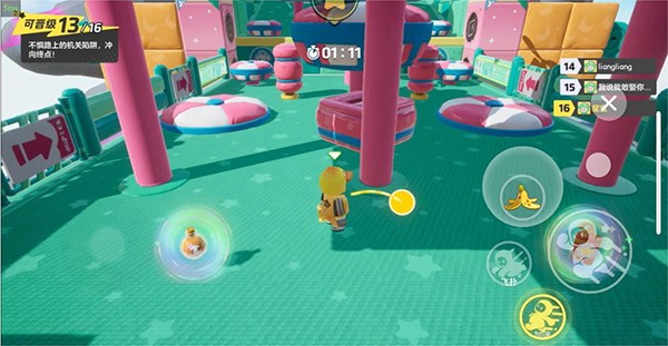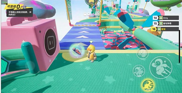 3、进入游戏,操作方面可以说跟蛋仔没什么差别,左边轮盘控制移动,右边分别为加速、飞扑、跳跃和道具使用。