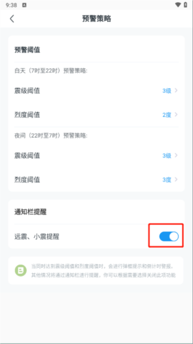 7、在【系统设置】中点击【预警策略】,打开通知栏提醒中的,远震、小震提醒