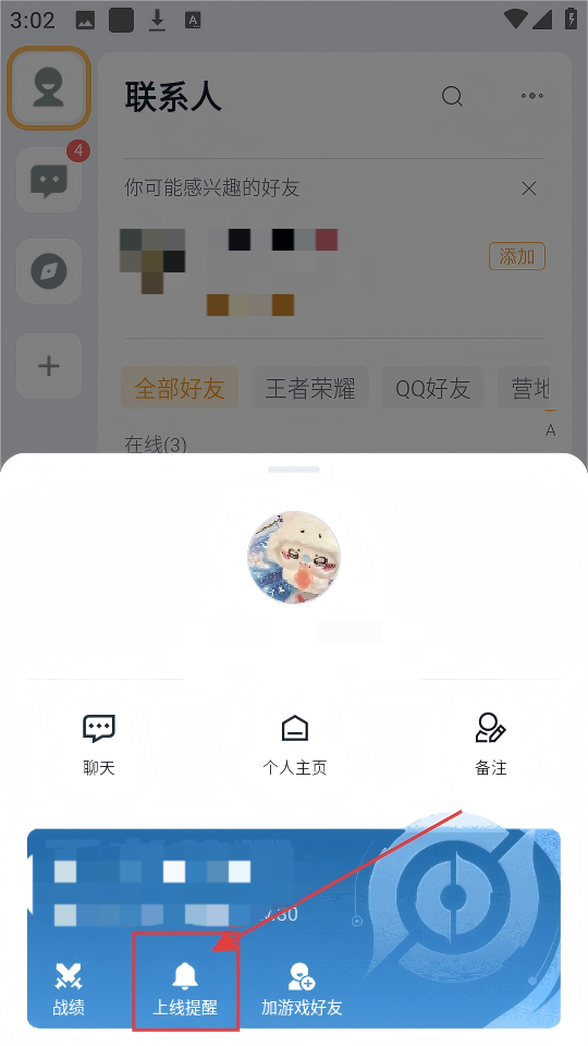 3、进入好友相关页面后,点击【上线提醒】,就可以设置好友上线提醒啦。