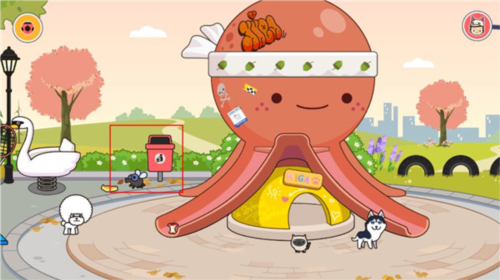 3、随机挑选一个进入,看到有垃圾可以放入垃圾桶内,保护环境从我做起,同时还可以让宠物们有更好的游玩环境,同时游戏中大部分的物品、动物都是可以移动的;
