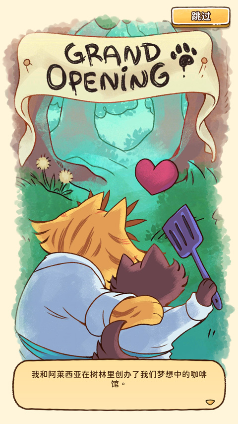 1、首先打开篝火猫咪咖啡馆,游戏开始前会有一段动画介绍游戏背景,点击右上角可跳过;